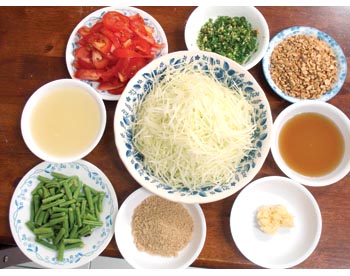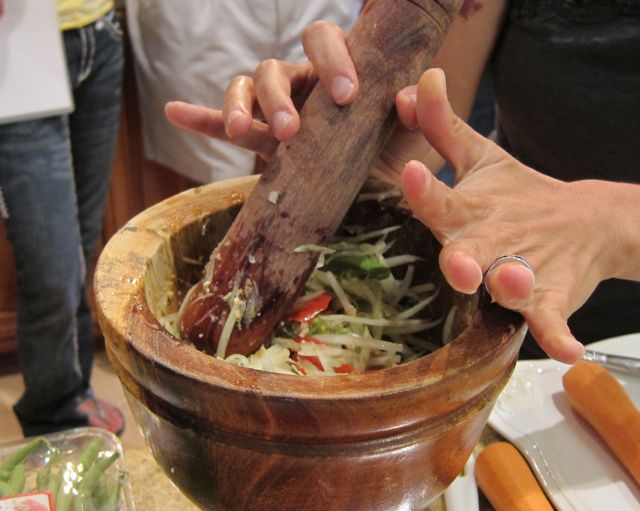 생선소스를 넣고 간을 한다. 채 썬 파파야를 넣고 다시 빻은 다음 그릇에 담은 후 잘게 썬 땅콩을 넣고 말린 새우로 장식하면