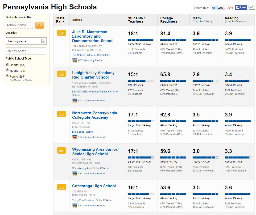 원하시는 주 (State) - 오른쪽 편 (High School Ranking By State)에서 주 (State)을 선택하시면 State별로 보실수 있습니다.