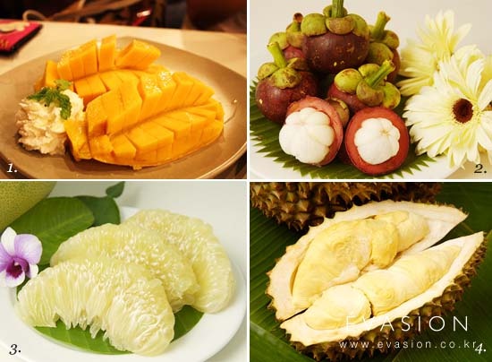 1 태국에서는 망고로 만든 다양한 디저트를 맛볼 수 있다 2 '열대과일의 여왕' 망고스틴 3 태국에서는 쏨오(Som o)라고 불리는 포멜로 4 '과일의 왕' 두리